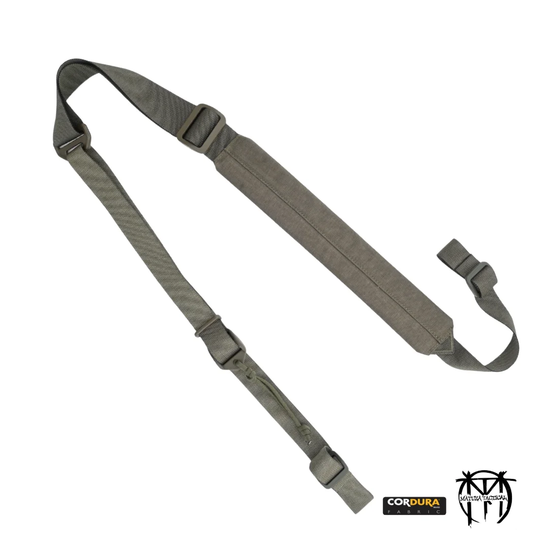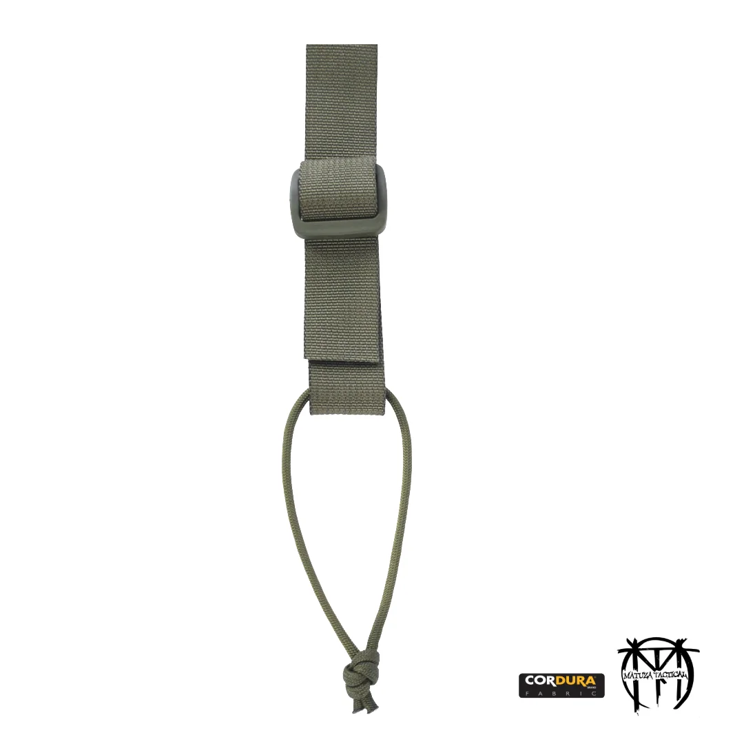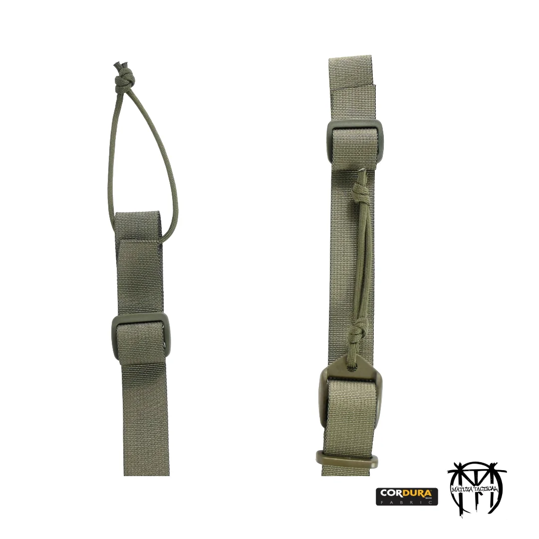 – Prie ginklo diržą galima tvirtinti paracord‘o kilpomis. 2 vnt. 35 cm ilgio virvės gabaliukai yra prie diržo komplekto. Taip pat karabinais, per kuriuos veriasi 2,5 cm dirželis (reikia užsisakyti atskirai).