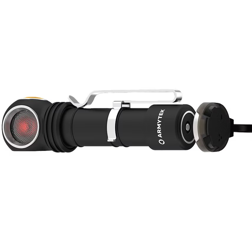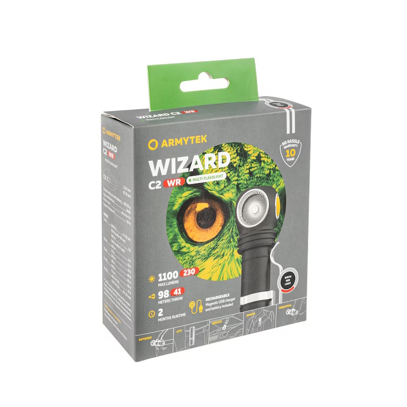 Žibintuvėlis Armytek Wizard C2 WR – tai daugiafunkcis kampinis žibintuvėlis su 4 LED diodais: 2 skleidžia baltą šviesą iki 1100 liumenų ir apšviečia iki 98 metrų, o 2 – raudoną šviesą iki 230 liumenų.
